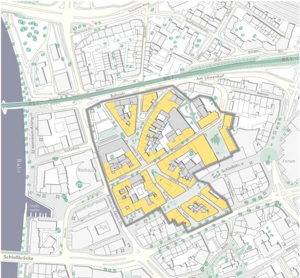 Basierend auf dem Stadtplan sind hier stilisiert die Straßen dargestellt, die das Viertel ausmachen: Maßgeblich sind das die Wallstraße, der Löhberg und der Kohlenkamp sowie direkt anliegende Bereiche.